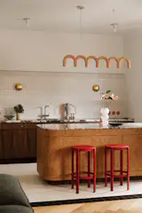 Florida couple John Pirman and Steve Tetreault built a new house inspired by the Sarasota School. Today’s FEMA codes required a plinth to lift the house five-and-a-half feet above grade and a roof that can withstand hurricane wind loads, making it a challenge to re-create the lightness of midcentury design, Pirman says.