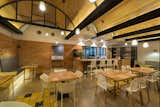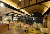 The project organizes space with wooden vaults above. The first bay is larger and segmented by frames and metal mesh. The four remaining smaller vaults do not close their arch, creating an opening that allows a feeling of spaciousness and continuity. The vaults are supported on steel beams suspended from the slab above and act as a source of indirect lighting.