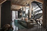 As well as incorporating materials having a local tradition – wood and stone – the project introduces others of a more contemporary nature, in some cases recalling a Mediterranean style. The floor resin, giving uniformity to the ground floor appearance, alternates between baked clay and sea-blue tiles, the same as used for the side covering of the kitchen’s work surface. The brass gives brilliant warm tones to the furniture details and to the work surface which also incorporates the cooking essentials and sink. The staircase, in finely worked steel recalls the grates of Arabian tradition, creating a chiaroscuro effect which is extremely unusual for the Alpine environment.
