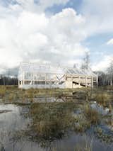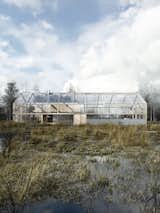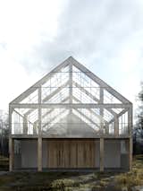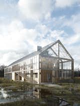 The house, the barn and the hall are combined into a single block of the GREENHOUSE in the form of a barn. The opening of the slopes has been thought through to facilitate the ventilation of the building and the use of terraces on the ground floor and balconies on the first floor. The divisions in the glazing were dictated by the size of the windows, which will come to the construction site straight from the dismanted elevation of the office building in Belgium. This 30-meter-long building by reflecting and absorbing sunlight during the day, and illuminating from the interior at night, will create a specific Light Farm on the green glade ...