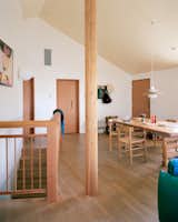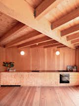 The almost-entirely tallowwood kitchen is custom. Muuto pendant lights, bar stools by Alvar Aalto for Artek, a Vola faucet, and a ceiling fan by Beacon Lighting finish the room.