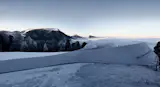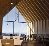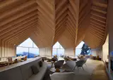 The cantilevering structure grows out of the hill like a fallen tree with three main branches creating a symbiosis with the landscape. Each of them is facing towards the three most important surrounding mountains. At the end of the branches a large glass facade frames the surrounding mountains from the interior of the hut. The sloped roof shape of the glasses takes his inspiration from typical huts in the area, while the branching roof and complex structural interior expresses a new and contemporary interpretation of the classic mountain hut.