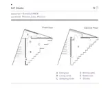 Artist Jimena García Álvarez-Buylla stands outside the pleated brick facade of her home and studio on the outskirts of Mexico City. The triangular building, designed by Estudio MMX, is set amid greenery on the same plot of land where Jimena grew up and her mother still lives. An open-layout ground floor holds a living area, a sleeping area, and a kitchenette.