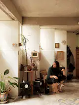The alternating glass-and-brickwork design was key to getting the lighting just right. “It allows light always to enter without being too harsh or direct,” says Jimena. The space is warmed with scattered rugs and wooden furniture, including a rocking chair that belonged to the artist’s great-grandparents.