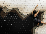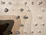 Patternity hand-painted the pattern on the plywood wall and integrated different coloured climbing holds into the surface design. The gradient of the wall can be adjusted from 11 to 50 degrees using a crank – accommodating both novice and accomplished climbers.Patternity created the bouldering wall as part of Ace's Ready Made Go 2 project, where a group of designers were invited to create pieces that will be used in the hotel.