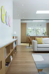 Mika, Kiku, and Kaz'ma play in the tatami room beneath the big skylight. The cushions on the floor were sent from Japan by the childrens's grandmother. The tatami mats were actually purchased in the UK from the Futon Company. Gaffney notes that they're not the proper dimensions of Japanese tatami mats, but they were much less expensive than importing the real thing.