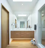 In the living room, Boomerang chairs by Peter Hvidt and Orla Mølgaard-Nielsen face a coffee table by Nicos Zographos. Custom pieces in the style of modular furniture pioneer Harvey Probber include sofas by Ablyss and a corner table by Crockett Woodworks. The Stiffel table lamp was purchased new by Scott’s parents in the early ’60s. The vintage artworks are from the David Cook Galleries in Denver.