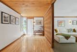 A walnut slat wall creates a protected nook for an office, in what used to be dead space. The white built-ins around the television are designed to “fade into the background,” says Amornvivat, and the team utilized custom open and closed storage throughout. “We have to get the right mix between the two to make the project sing,” says Amornvivat.