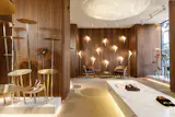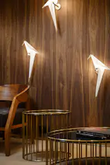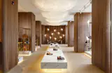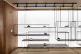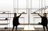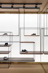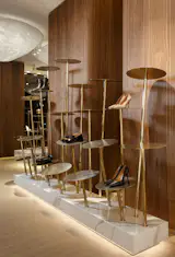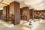 MONO Architects were inspired by the tradition of creating premium handmade shoes, and we tried to create a unique atmosphere which could be inherent in this place. The main design concept is the Garden of Eden the main elements of which are petal-shaped shelves made of brass.