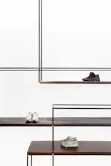 The main hall is open-spaced room with cozy zoning for men’s and women’s shoes and a fitting zone. There is a small area for sports shoes close to it with more modern design accents such as luminous lightboxes which serve as a background for a graphic metal construction with leather shelves.