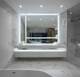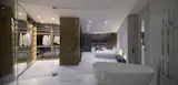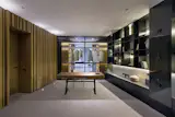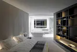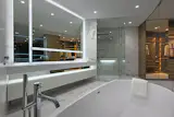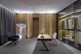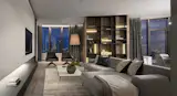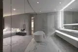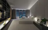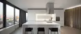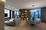 The apartment is located in the new SKYLINE building in the center of Kyiv. The architecture of this building and the modern approach to the design of its public areas set a vector for our further interior creation. The apartment has a radial layout and it wasn’t easy to work with it. We decided to divide the space into two functional zones: private and public ones. The public part of the apartment is a flowing space of a living room with a home cinema, a dining area and a kitchen island. The private part of the apartment combines a spacious bedroom with its own bathroom behind a glass partition and a cozy private study.