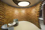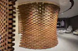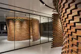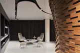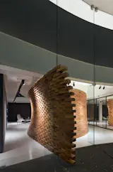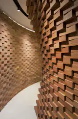 This shop creates custom suits of the highest quality, with hand woven fabrics of worldwide-recognized textile houses; it has a front of 9 m of clear glass, which functions as a window display. Its horizontal planes - both floor and ceiling - are reflective and highlight the centerpiece of the project, which is built with 2,050 wooden bricks; a niche that embraces whoever occupies it, a space for a unique luxury experience, where the finest styles of recent decades are retrieved, projecting a future in which tradition and innovation work together, symbolizing the ideology of modern man.