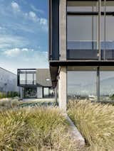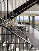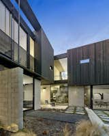 Two offset “bars” were used to create front and rear courtyards divided by a two-story breakfast space. The ground floor is organized by four parallel lines of masonry walls oriented toward the site’s views. These walls define the house’s two bars and are both interrupted and connected by windows and glass doors. The eastern wall of each bar is buttressed at regular intervals to subtly define interior spaces and to eliminate the need for interrupting shear walls or expensive moment frames. The second floor is composed within four boxes balanced upon the masonry walls below, and clad in charred cedar. Large glass windows at this level are framed in projecting metal hoods that address the harsh western sun exposure.