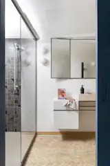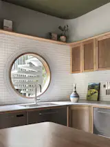 In the living room, a wood stove keeps temperatures cozy. The artwork (of the ill-fated St. Francis Dam and reservoir) is by Al Stone, as is the built-in stove platform and bench seat. The sofa is from Blu Dot, the vintage Risom Lounge Chairs from Knoll and pillows by Kiriko Made.