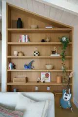 Both the walls and the maple cabinet facings in the kitchen are covered in a toxin-free whey-based finish. Clove-colored 2-by-10-inch backsplash tiles mimic the alley’s brick street, and the wall is covered in spray cork, a paint substitute made primarily of cork granules. The door pulls are closet knobs that Jack retrieved from his grandfather’s house in D.C. before it was torn down.