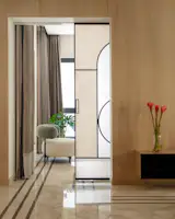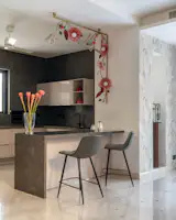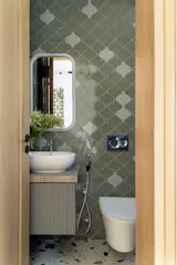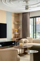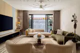 The journey through Alcove begins at the foyer, a welcoming entryway designed with minimalist seating and a console. The space flows naturally into the formal living area, which doubles as a TV room, reflecting the home’s emphasis on comfortable, versatile spaces. Adjacent to the living room is the concealed powder bathroom, cleverly integrated into the wall paneling for a sleek, uninterrupted look. From the living room, the design leads into the dining area, flanked by a dry kitchen on one side and a guest room on the other. This spatial arrangement emphasizes functionality, allowing each room to serve its purpose without feeling disjointed.
