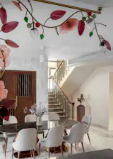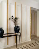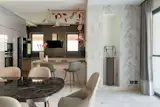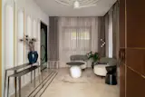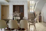 Throughout the home, marble is a key material, used extensively for flooring and tabletops to create a cohesive, luxurious feel. To add texture and depth, the design team employed MDF 3D paneling on select walls, complemented by a range of interesting wallpapers that tie into the home’s overall aesthetic. The color palette is intentionally diverse, but subtle enough to ensure that no single color overwhelms the space. By keeping the walls and floors neutral, the designers have allowed the furniture to shine. The vibrant colors of the sofas, chairs, and other decor items bring life to the home, yet they are carefully balanced to avoid creating a chaotic or overly busy environment.