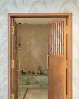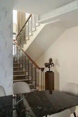 Ascending to the first floor, one enters a landing area that doubles as an informal family room. From here, access is provided to a balcony on the left, the son’s room straight ahead, and the master bedroom on the right. The master suite is particularly luxurious, featuring a walk-in closet and an ensuite bathroom designed for comfort and ease. The daughter’s room stands out as a space where the design team was able to experiment more freely. In contrast to the rest of the home, this room features a mix of flooring patterns, shapes, and textures, creating a playful and dynamic environment. The combination of unique wallpaper and colorful furnishings makes this room a design highlight, offering a departure from the more subdued aesthetic found in the rest of the home.