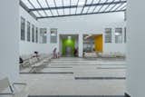Located on an extensive corner site, the built environment of the campus is resolved into constituent blocks which fan out symmetrically around a diagonal axis, allowing for efficient circulation and clearly defined entry-exit points. An expansive arrival lobby under a sky-lit atrium, is the waiting zone, and connecting space between the two wings of the hospital. Skylight floods the space with natural daylight, while clearstory ventilators efficiently expel warm air, ensuring a naturally cool and comfortable ambiance. From here, the medical college building is accessed through a passage across the verdant central plaza at the heart of the campus. The college building comprises of symmetrical wings connected by a monumental bridge that extends from the central library and auditorium block. This central hub also boasts of a terraced amphitheater at its zenith, ideal for hosting large gatherings and outdoor events.