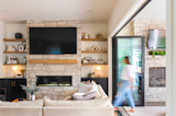 Being the space where the family spends most of their time in, the living room is an ever-evolving, central room that transitions to the kitchen and outdoor patio. The room pairs mixed materials like wood, rich velvet, and creamy upholstery to create a warm, inviting ambiance. Custom built-ins, floating shelves, and seasonal décor personalize the space, in tandem with the custom natural stone fireplace. Designed with both functionality and comfort in mind, the piece de resistance is the featured NanaWall Generation 4 bifold door that filters in natural light and connects to the outdoors.