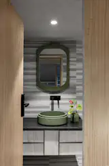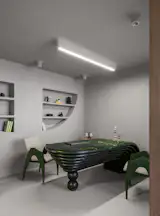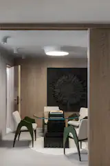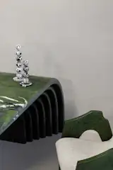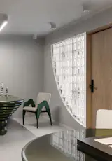 The standout feature of the office is the dramatic avocado-quartz table, almost sculptural in its presence. If office spaces tend to feel dull, this single bold element proves that one playful statement can redefine a room. For Bihani, the table counters the rigidity of a conventional boardroom, introducing “an emotional materiality” that balances the space’s earthy palette.