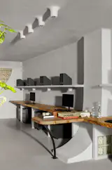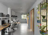 While ferrocrete and epoxy give the space its curves and form, other carefully considered materials introduce warmth and a biophilic touch. Tables made from salvaged oak display their natural grains, with supporting structures crafted from scrap, turning sustainability into a tangible practice rather than a concept. Handmade ceramic planters soften the concrete palette, their natural colors and live plants bringing comfort and rustic charm to the contemporary office. “It’s about letting the raw become refined, intentionally and artfully,” says Bihani.